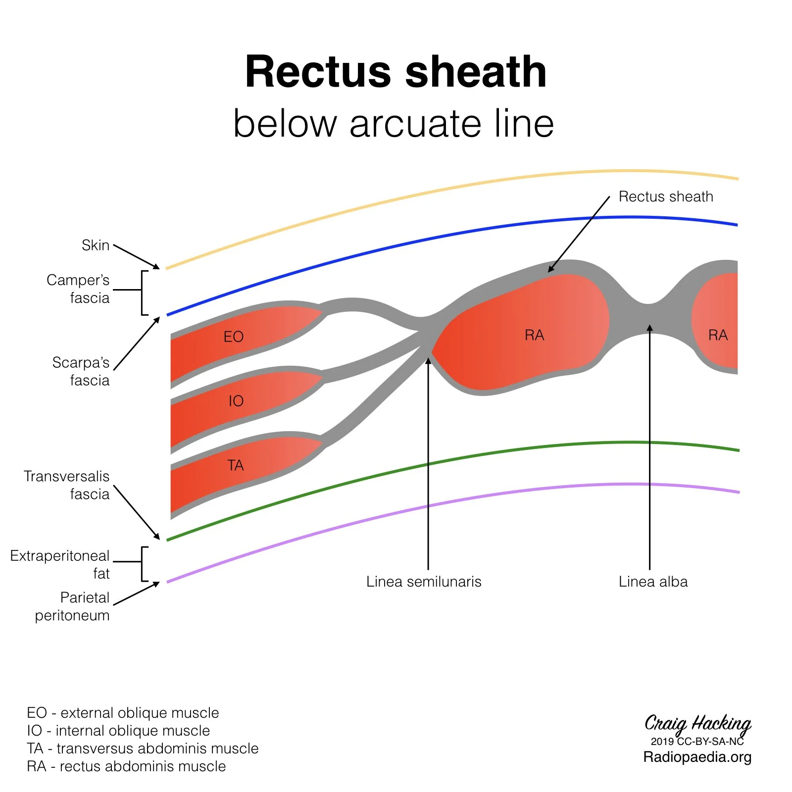 Will be at or below level of arcuate line = no posterior rectus sheath at this level, TA and IO fibers run parallel here