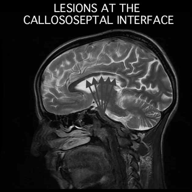 Note: MS lesions typically involve the callososeptal interface (first picture) and extend up into the callosal substance.