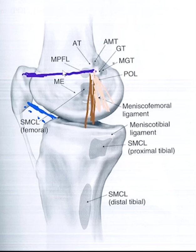 i.e. MCL femoral attachment, ACL tibial attachment