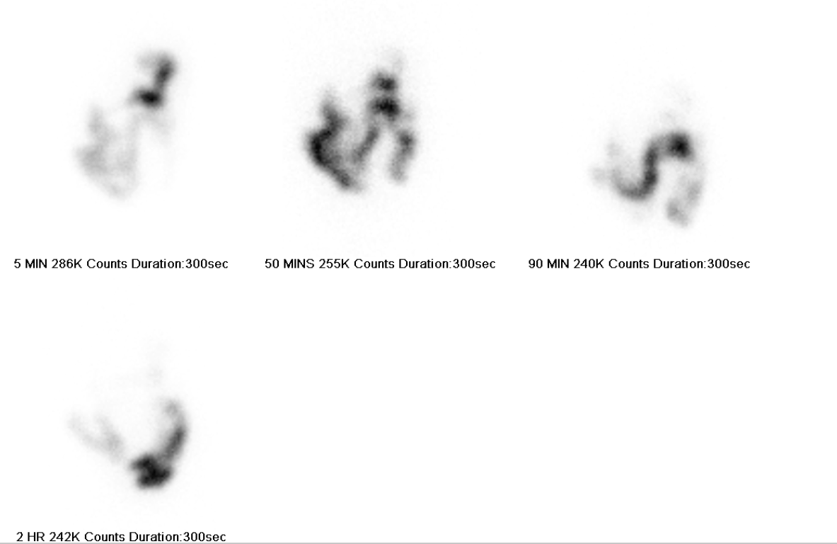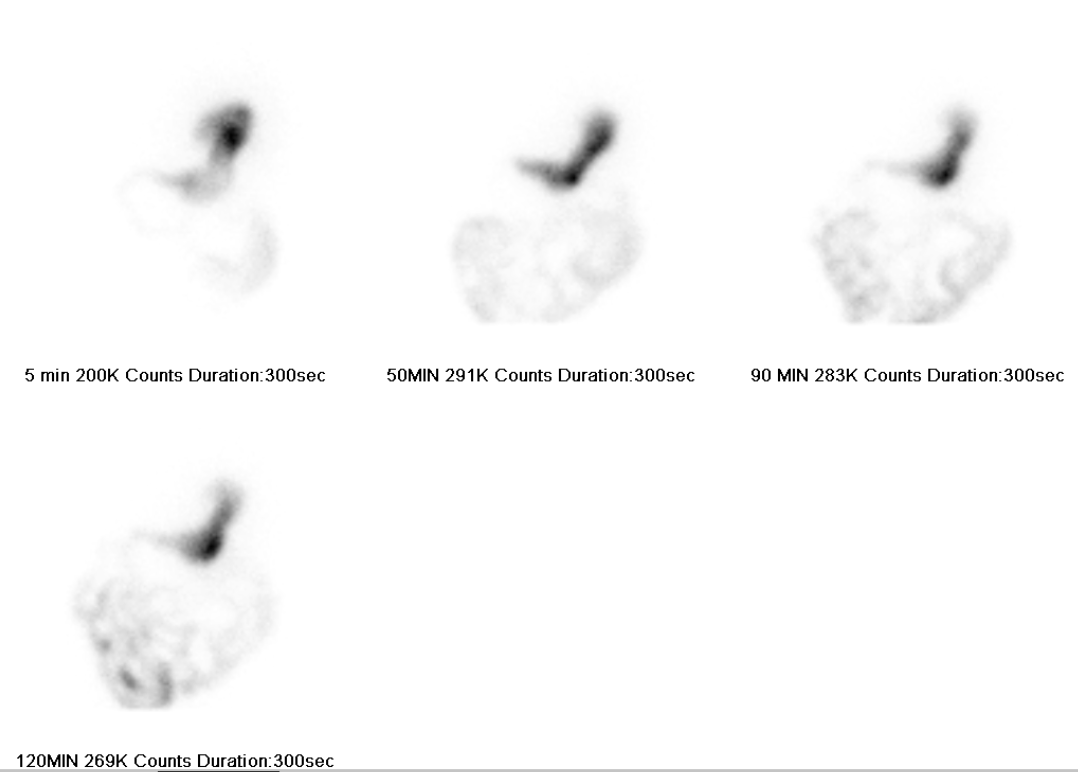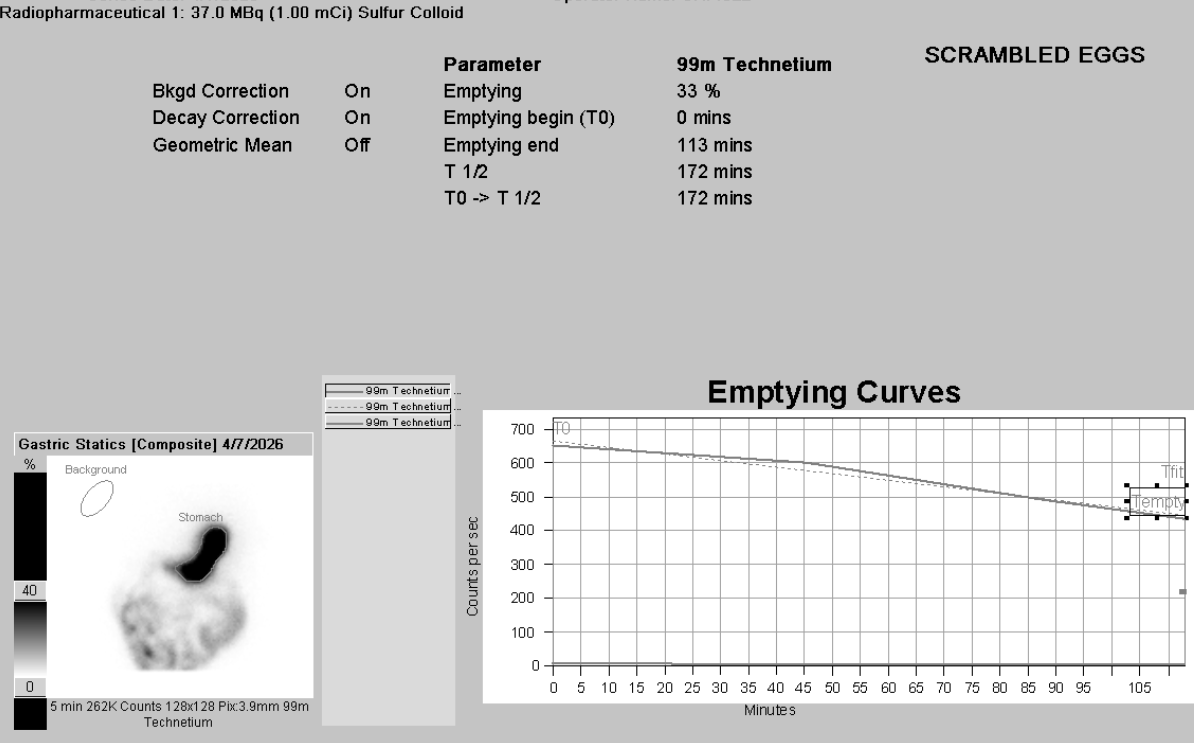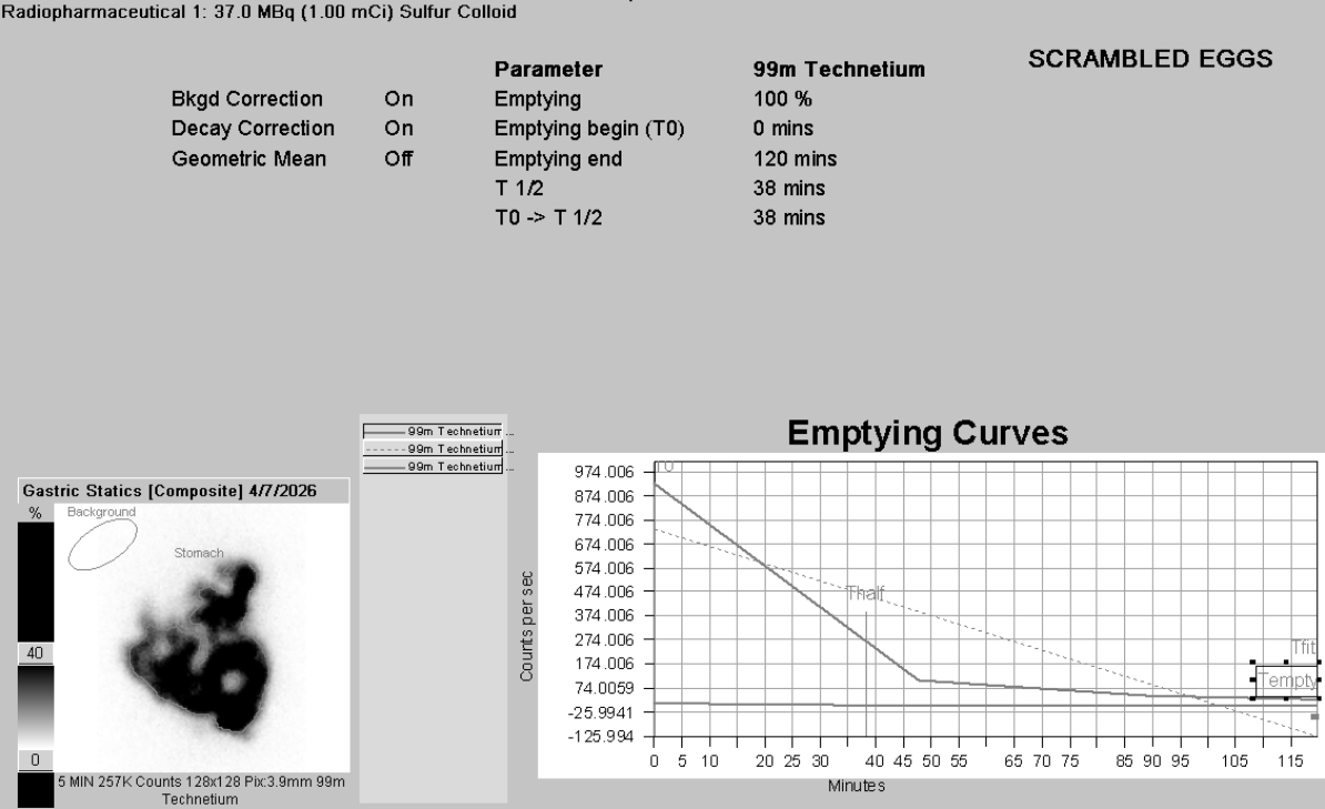Note that a typical gastric emptying scan goes on for 4 hours, so you need to correct for radiotracer decay in order accurately asssess the radiotracer amount