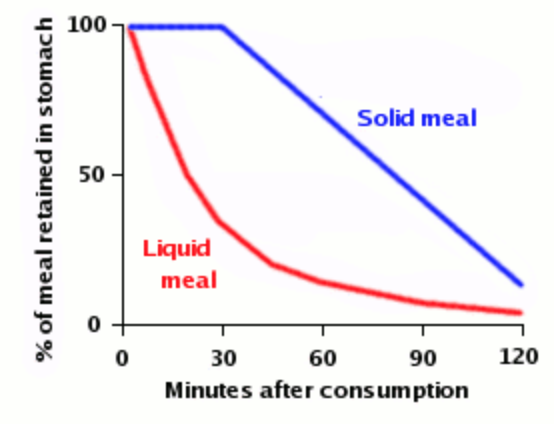 Need to be broken down into smaller pieces by the stomach so there is an initial delay where time passes and no food leave the stomach because it is being broken down, this is the lag phase