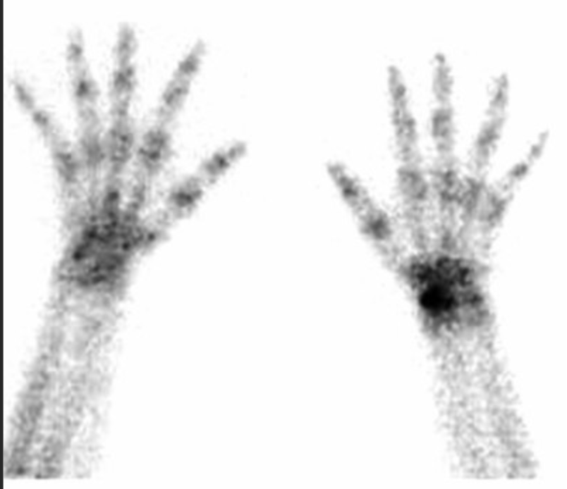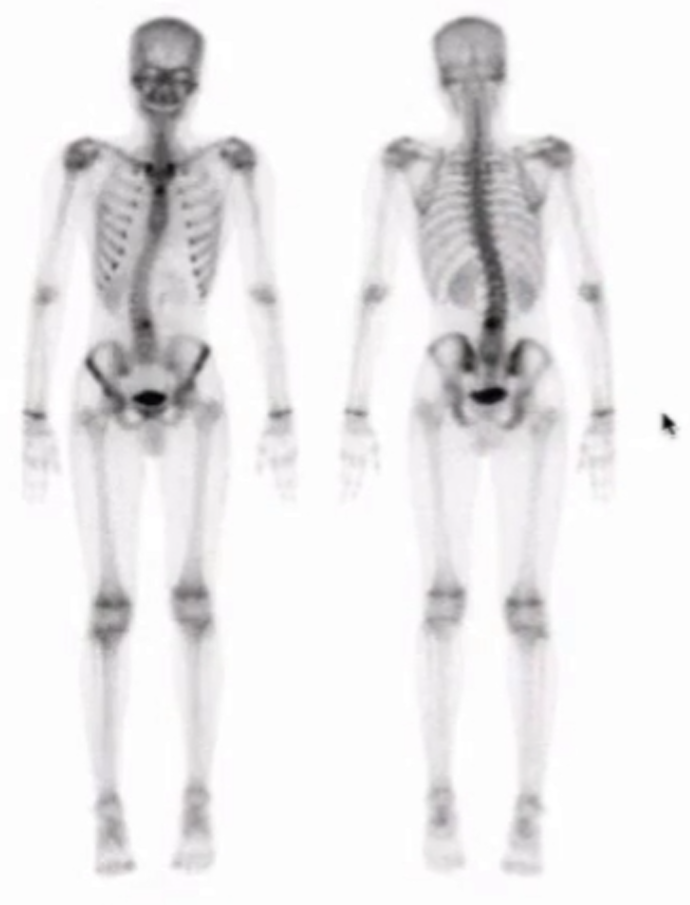 Bone scan and kidneys are hot but only the cortex is hot, not the whole kidney