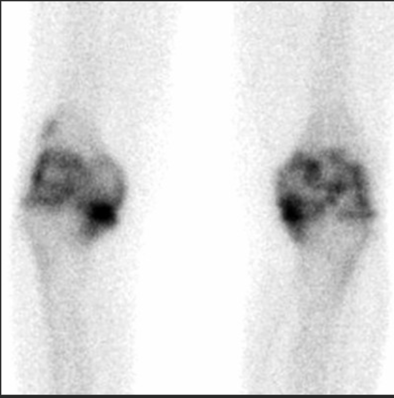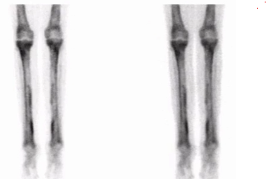 Seen as diffuse uptake in the posterior-medial tibial cortex