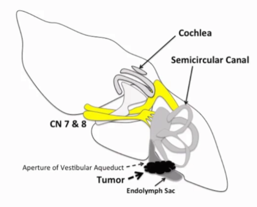 Vestibular aqueduct = tube that extends from vestibule to petrous temporal bone and contains endolymphatic sac and endolymphatic duct